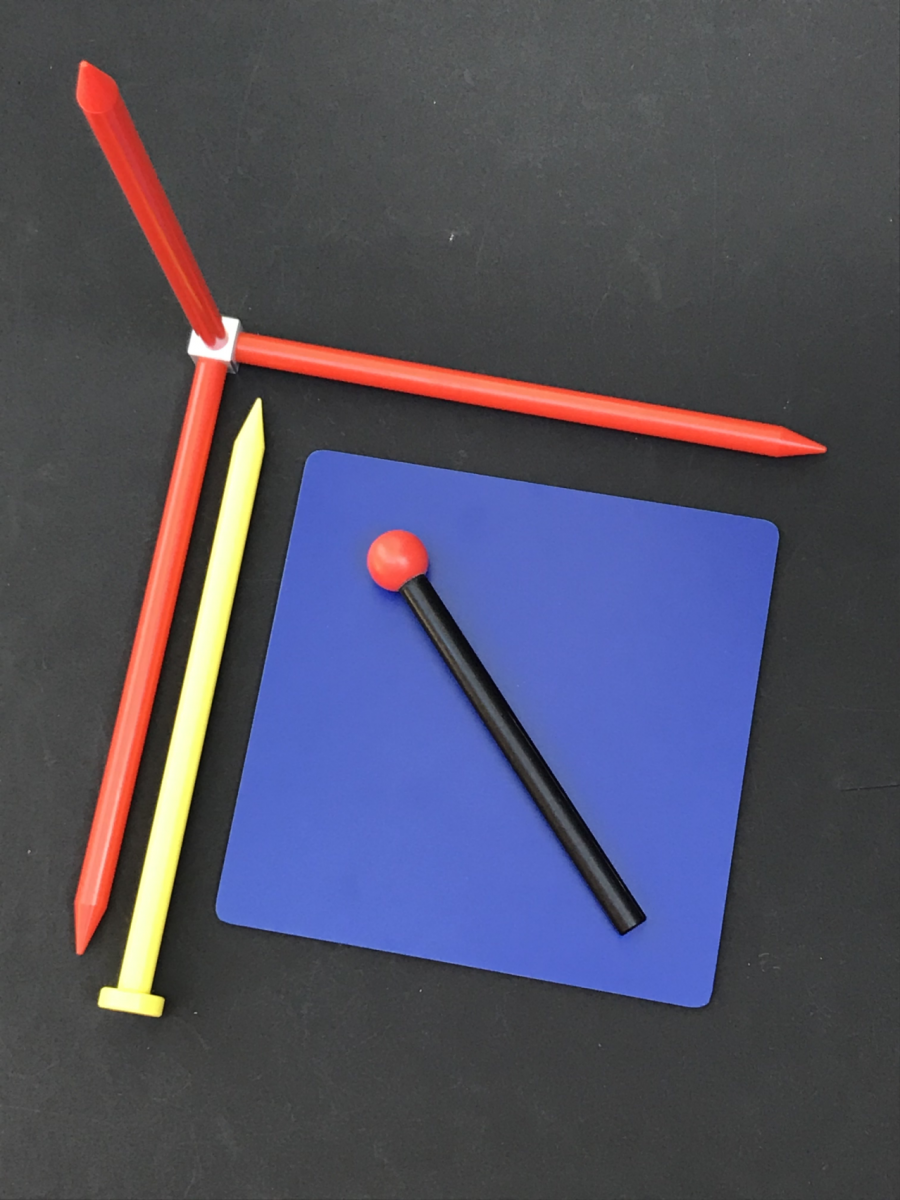 A group of models for demonstrating fundamental GD&T and CMM concepts, including (1) a 12"x12"x12" Cartesian coordinate system for explaining coordinate system components and degrees of freedom (collapsible for storage), (2) a 12" normal vector, cylinder axis and lecture pointer, (3) a Ø2"x8" long, clear cylinder for demonstrating cylindrical and tube like tolerance zones, (4) a 10"x10" planar surface for demonstrating the properties of planar surfaces, and (5) an 8" long "ruby" ball probe for demonstrating CMM probing strategies.